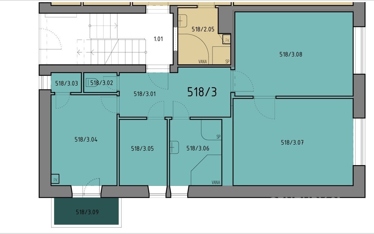 Fotografie 14/21 Chodba s dlažbou, dřevěnými úložnými prostory a bí